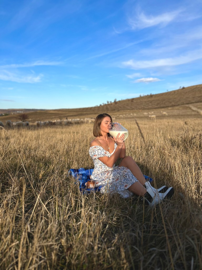 This photo of me standing in a field, surrounded by sheep, holding a jar of fresh milk — it looks peaceful.